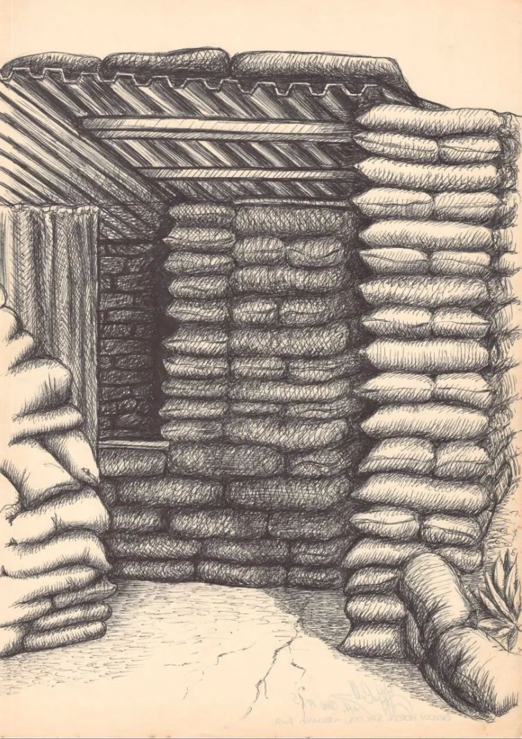 A ball-point drawing of the entrance-way to the ‘Crazy Horse Saloon’ bunker, #Rundu, Kavangoland, 4 January 1985