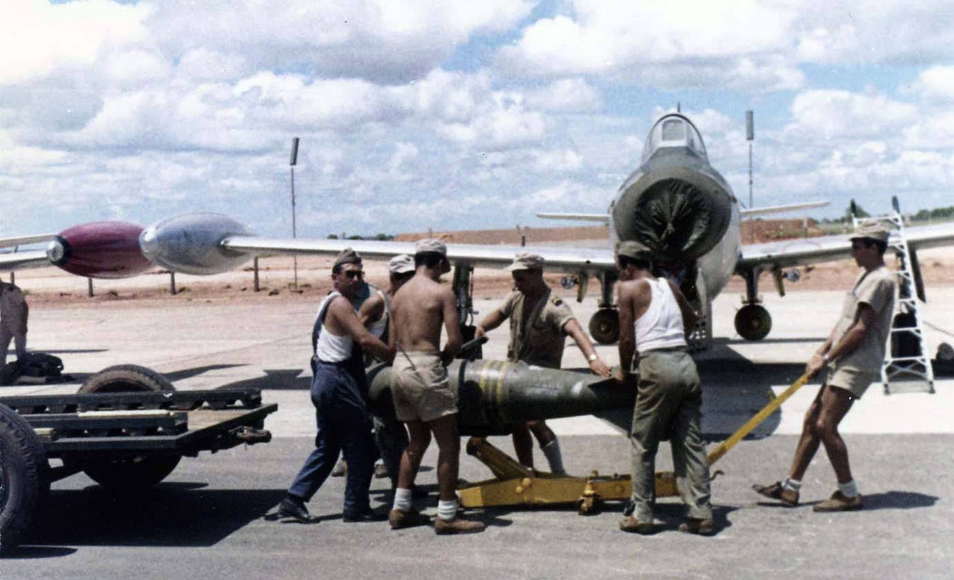 A Portuguese Air Force #F-84 Thunderjet being loaded with ordnance in the 1960s, at #Luanda Air Base.