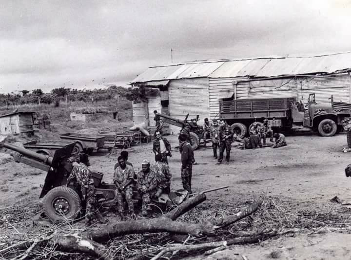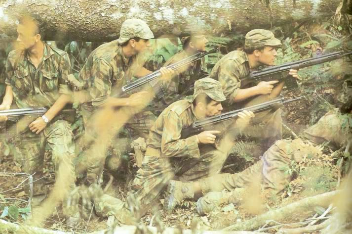 A Portuguese patrol return fire during the Portuguese Colonial War, circa early 1970’s