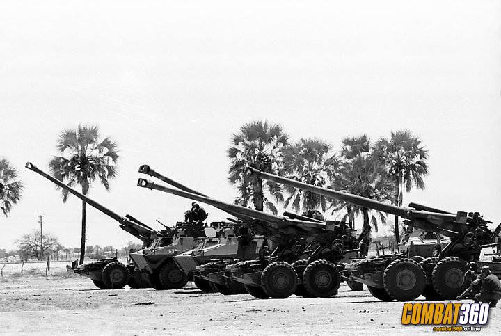 Reacting to Intel on Cuban troop movements in southern Angola in October 1988, the SADF’s Ombalantu military base near the SWA/Angolan border goes on high alert. Here four G5 155mm howitzer guns and a couple of Ratel Infantry Fighting Vehicles point their guns towards the Angolan border whilst lining up in the open field outside the base (the base…Read More