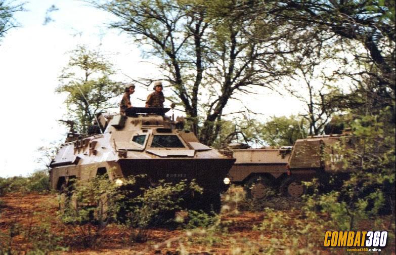 South African patrol travelling in an ‘Buffel’ anti-mine armoured troop carrier near the Angolan South West Africa/Namibia border.