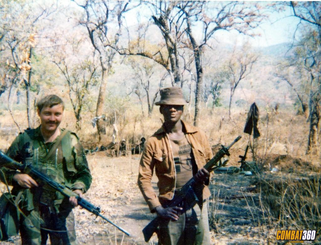 July 1979 A Rhodesian Armoured Car Regiment Soldier with a member of the Pfhumo Rhevanu (“Spear of the People”) – they were turned terrs who decided for whatever reason to side with the government. Many had been captured (in some cases liberated from the PF) by the Selous Scouts or other Rhodesian Security Forces.