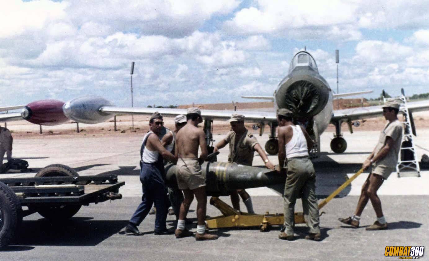 A Portuguese Air Force F-84 Thunderjet being loaded with ordnance in the 1960s, at Luanda Air Base.