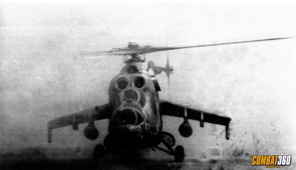 This rather surreal and dark image of a enemy Angolan #Hind Helicopter operated by FAPLA taking off in Angola during the Border War in the late 1980’s.