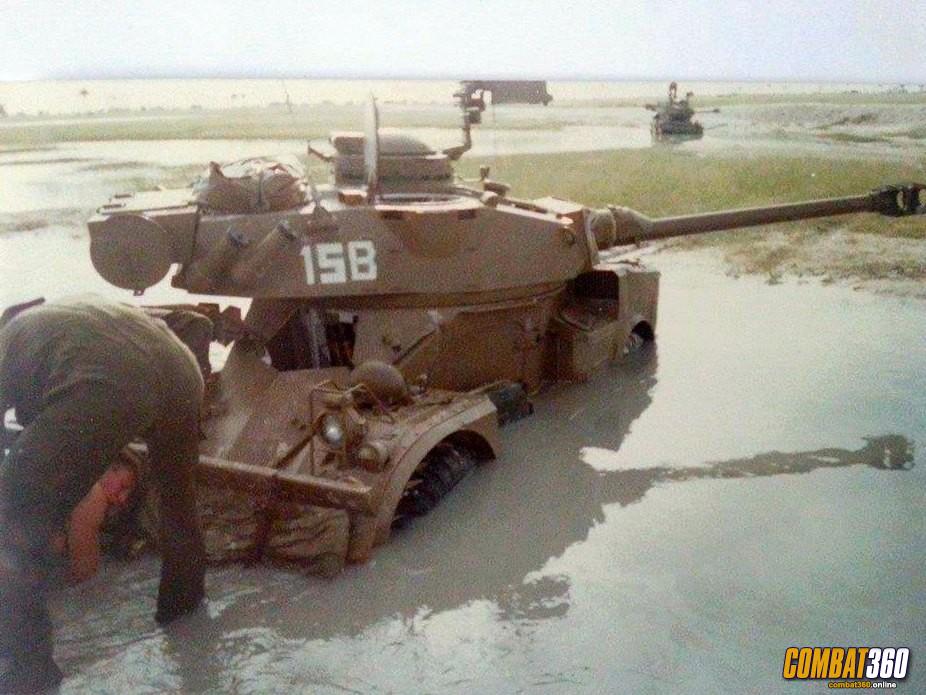 Crew of an #Eland 90 armoured car at work freeing their vehicle, after it bogged down in a flooded shona (flood plain) during the annual rainy season in Ovamboland – South West Africa/Namiba.