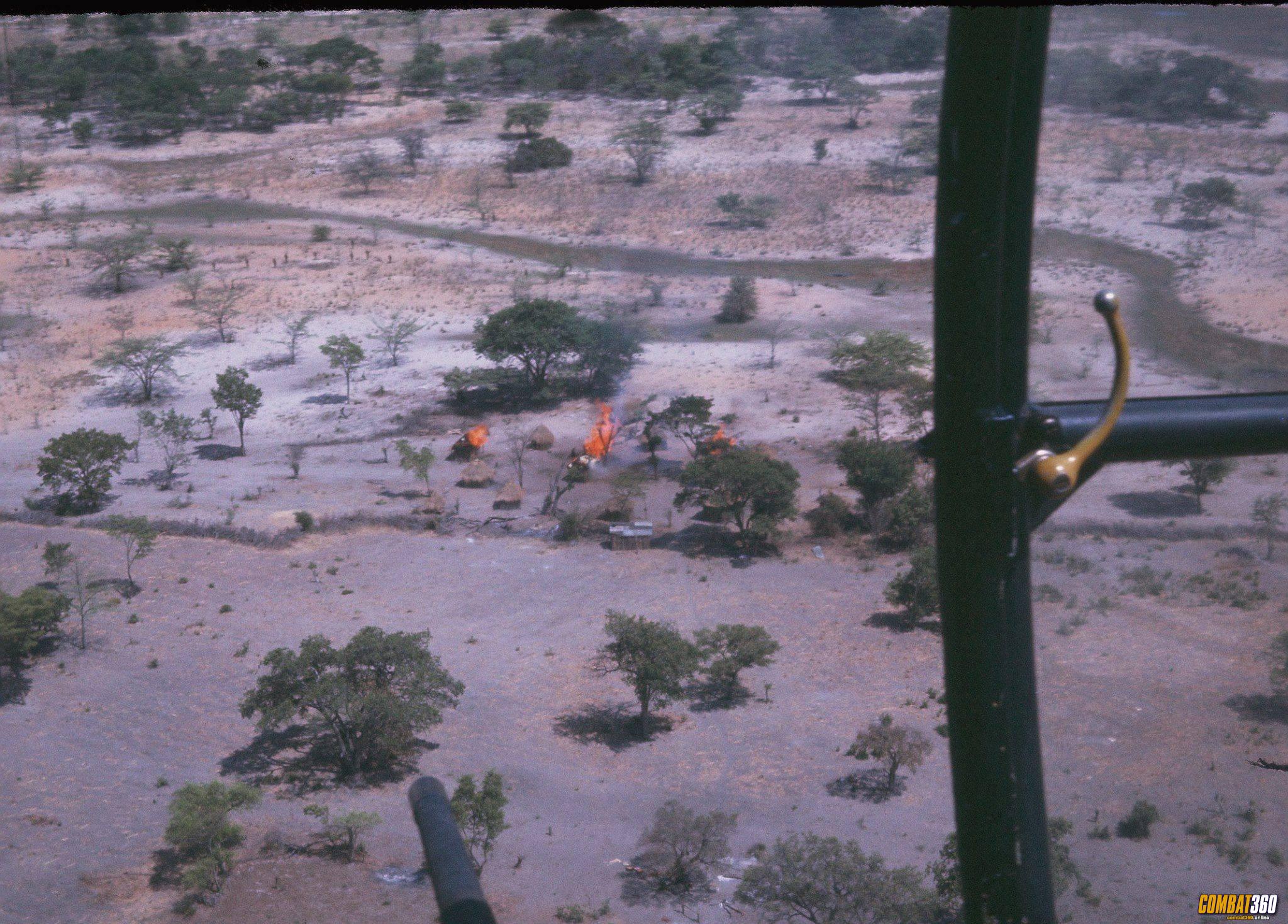 This photograph was taken from a South African Air Force Alouette gunship helicopter called in for close fire support to a SADF Army ground patrol who had hit a contact and where taking intense small arms fire from civilian dwellings in a village.