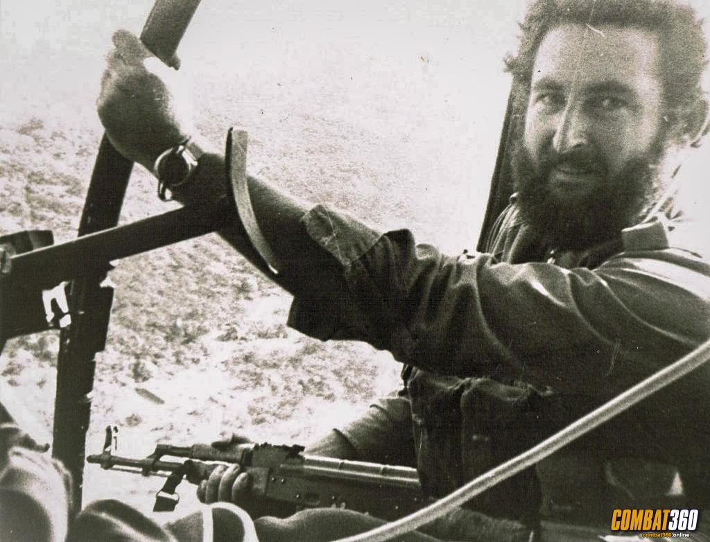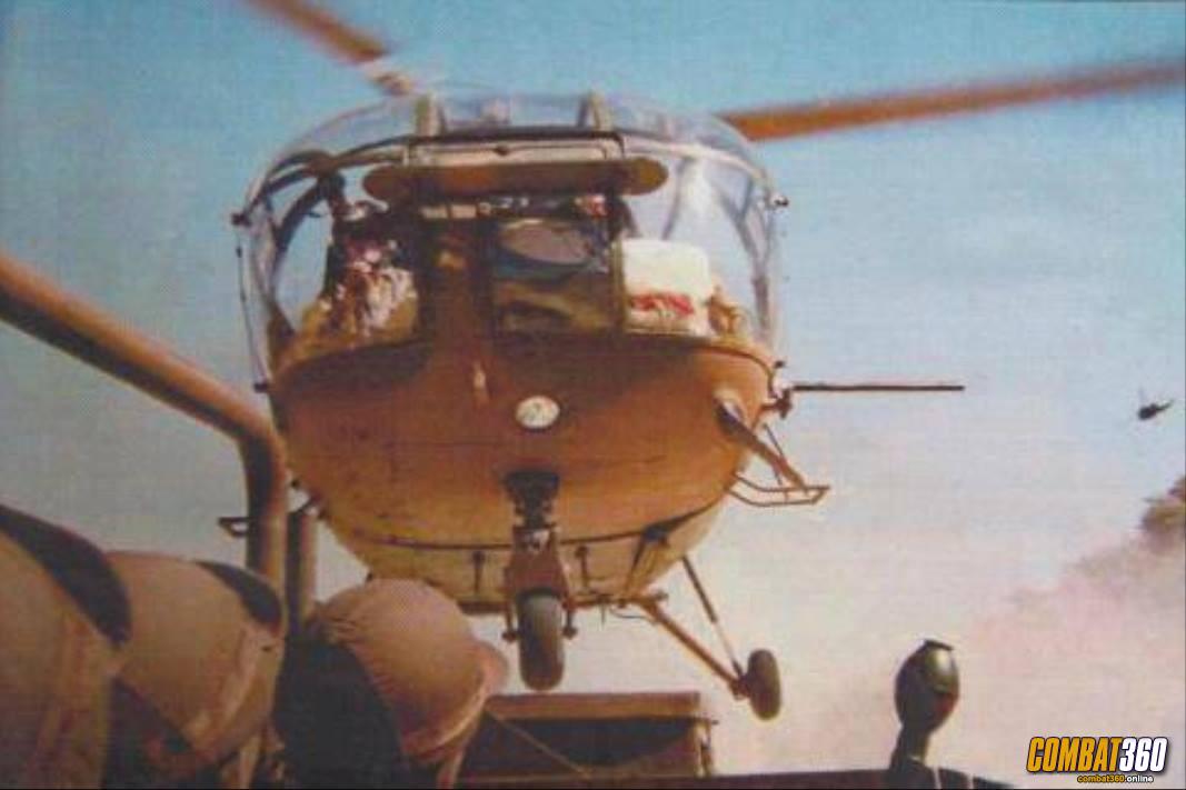 Derek Andrews whilst serving with the Selous Scouts, aboard a French manufactured Aérospatiale Alouette helicopter returning from a successful operation in the Hot Springs region of south-east Rhodesia.