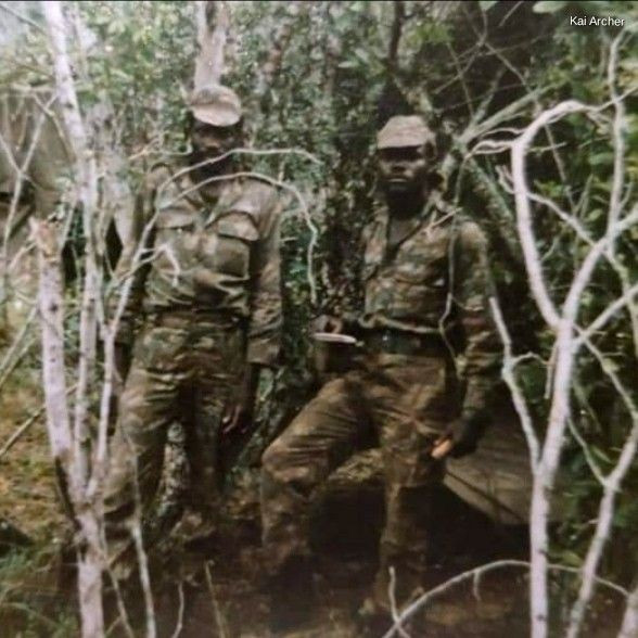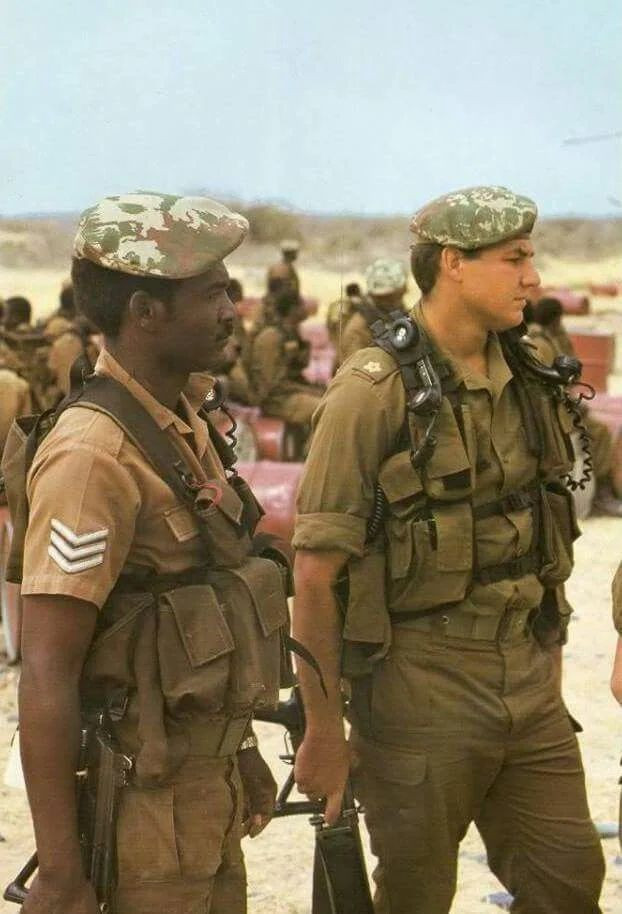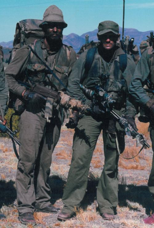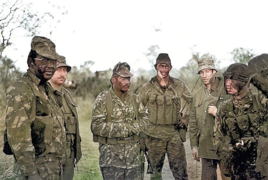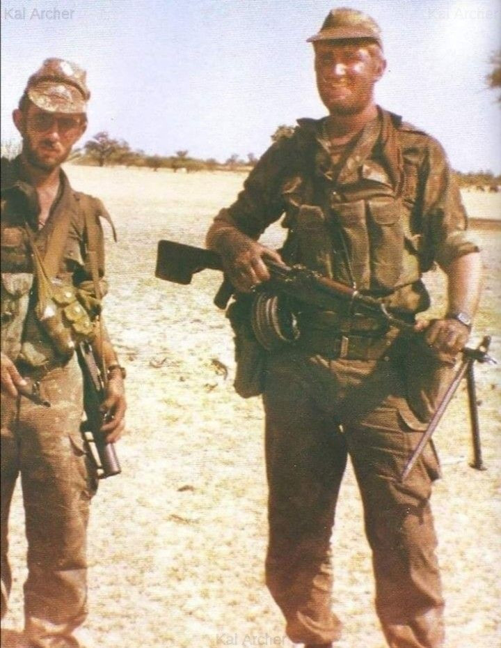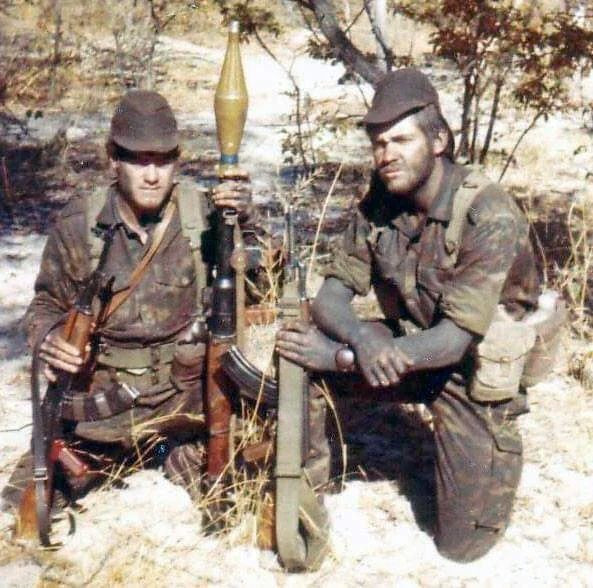 South African small team Recces returning from a mission in Angola. Man to the left became SF RSM, and the man to the right pretty much invented small team concepts for the SADF. José Da Costa and Andre Diedericks (RIP). 80’s