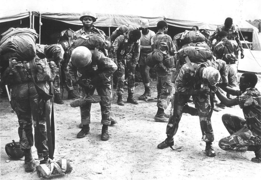 #Rhodesian African Rifles ( #RAR) soldiers being kitted up for a paradrop by Dakota at 400-500 feet as part of a Fire Force deployment against #ZANLA insurgents.