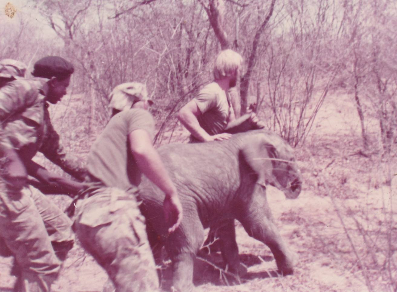 Arn Durand’s #Koevoet team in hostile territory, stopping to helping a young elephant calf back to it’s mother, Kavango, Southwest Africa circa. 1980s