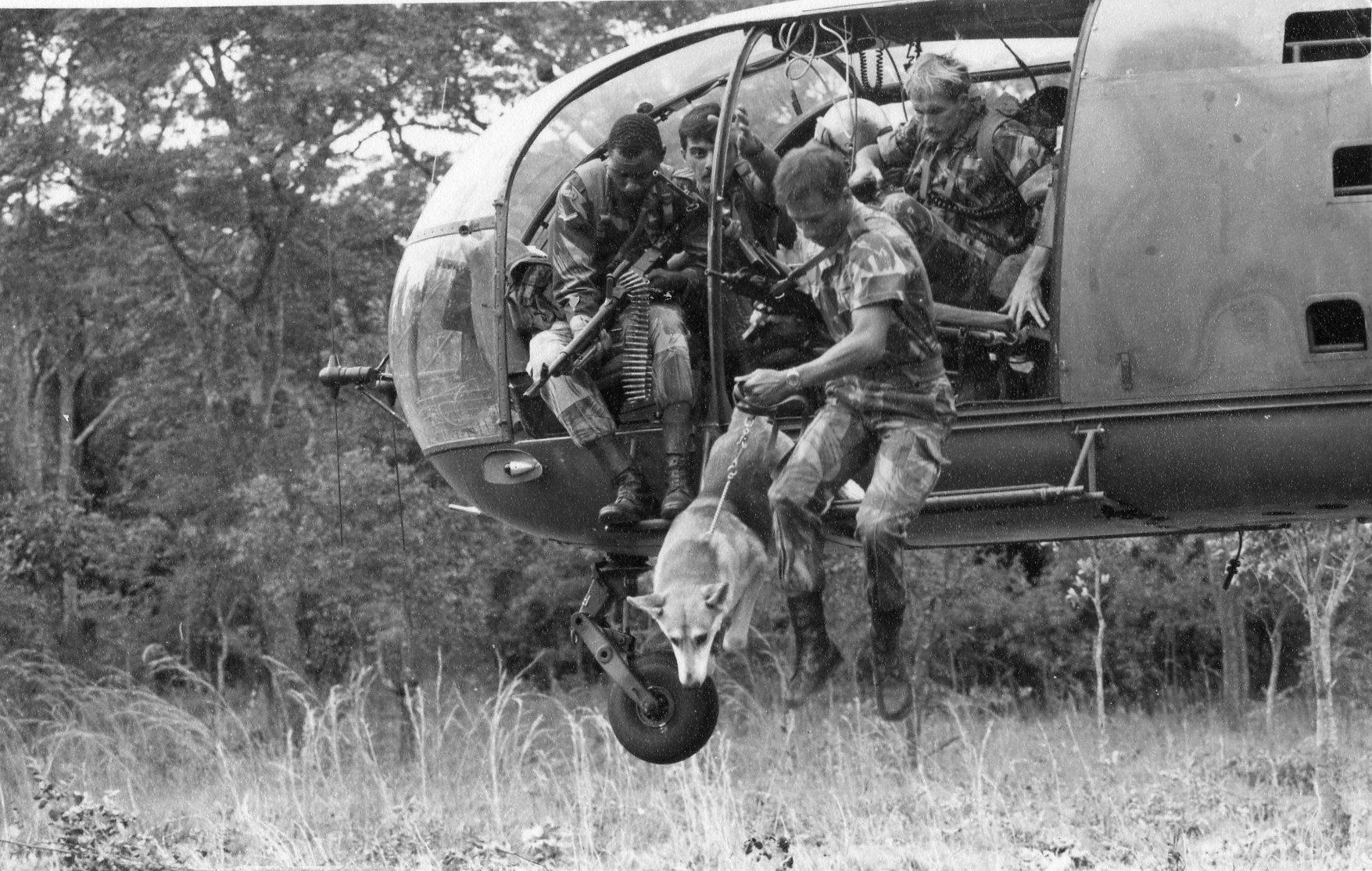 #BSAP (according to the caption online, but I can’t be sure) dog handlers dismounting to hunt for the terrs #Rhodesian #Alouette