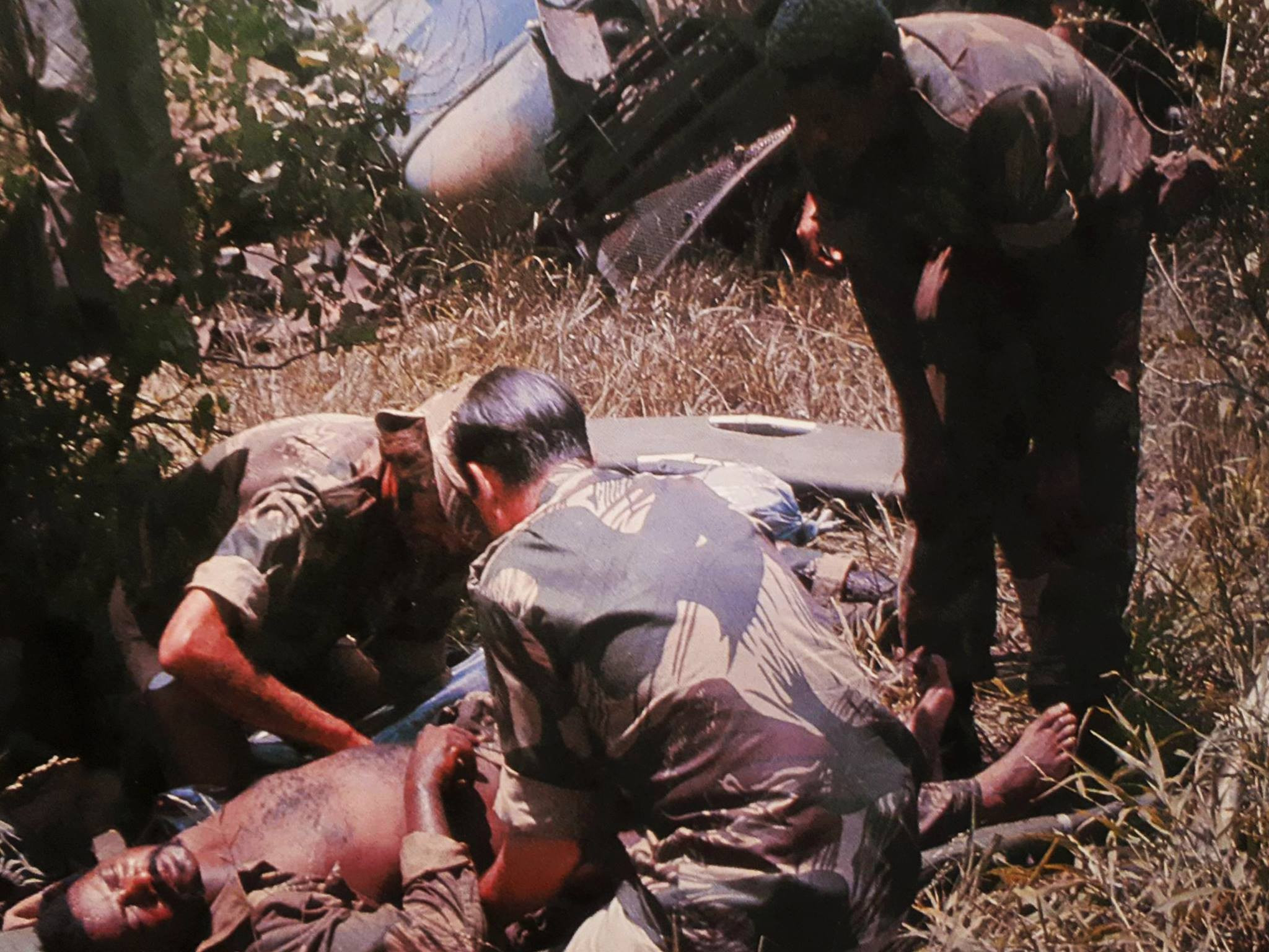 White Portuguese troopie carrying a wounded African comrade in Mozambique, 1970.