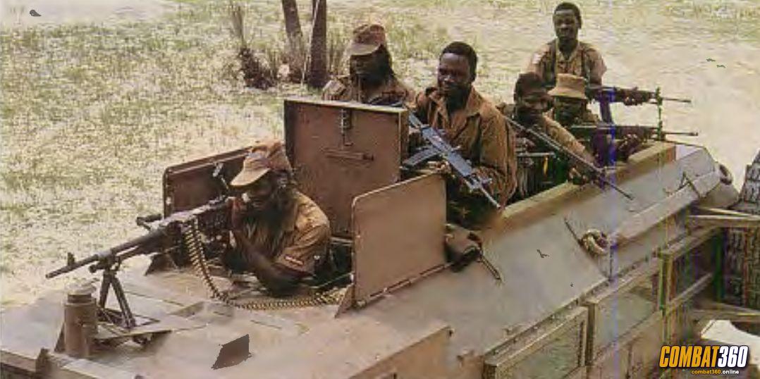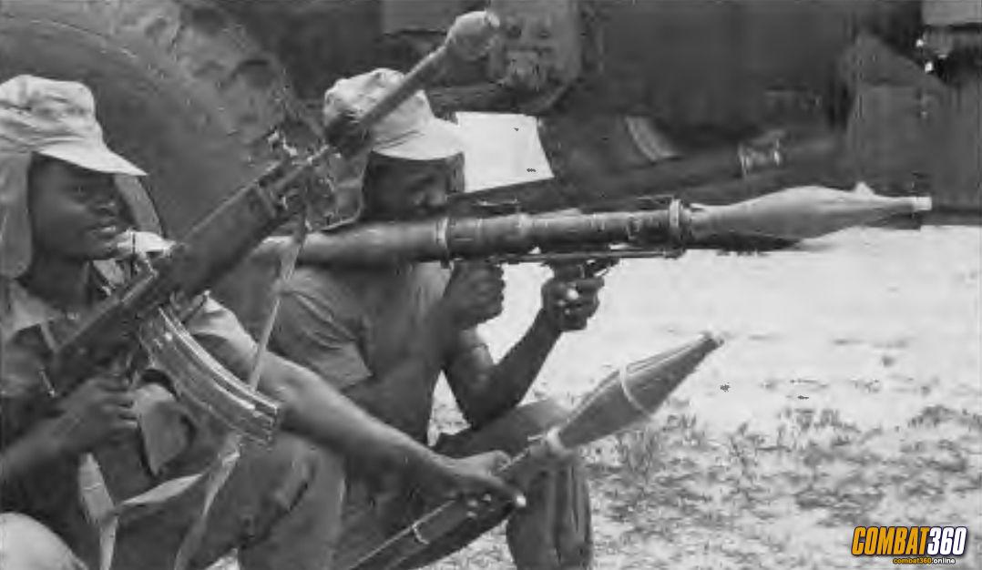 Two Casspirs in every team are equipped with the RPG-7V; Arabic markings on PG-7 warhead indicate Syrian manufacture. Note trooper with South African anti-personnel rifle grenade constructed by using body of M26 hand grenade and attaching it to base fuze assembly and finned tail unit.