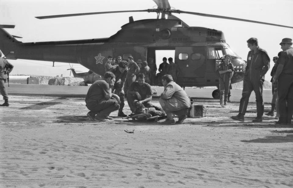 1980, Operation #Sceptic. Captain Tinus van Rensburg lying on a stretcher after being brought back to South West Africa/Namibia.