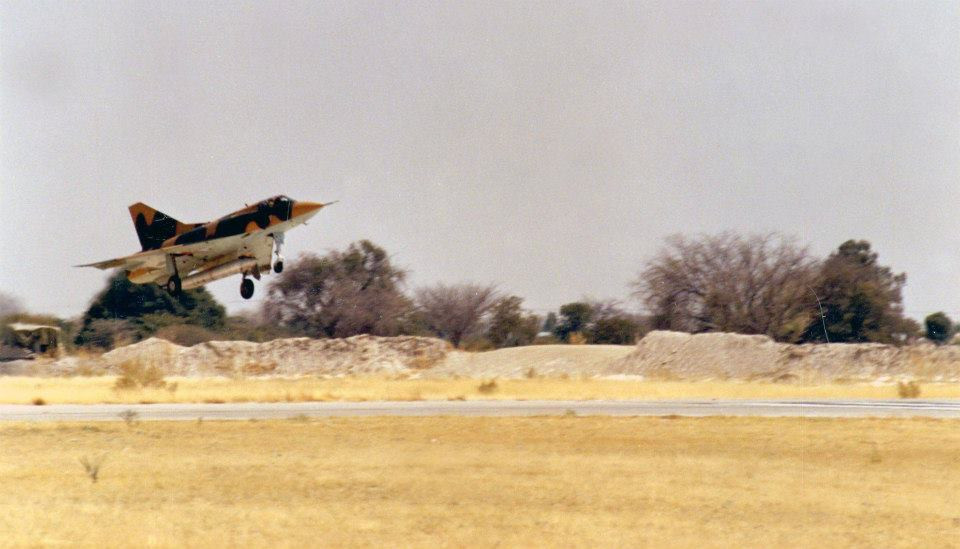 Bush War – South West Africa/Namibia operational area on the Angolan border – here a South African Air Force 2 Squadron Mirage IIICZ is seen landing at Air Force Base (AFB) #Ondangwa after returning from a bombing mission in Southern Angola.