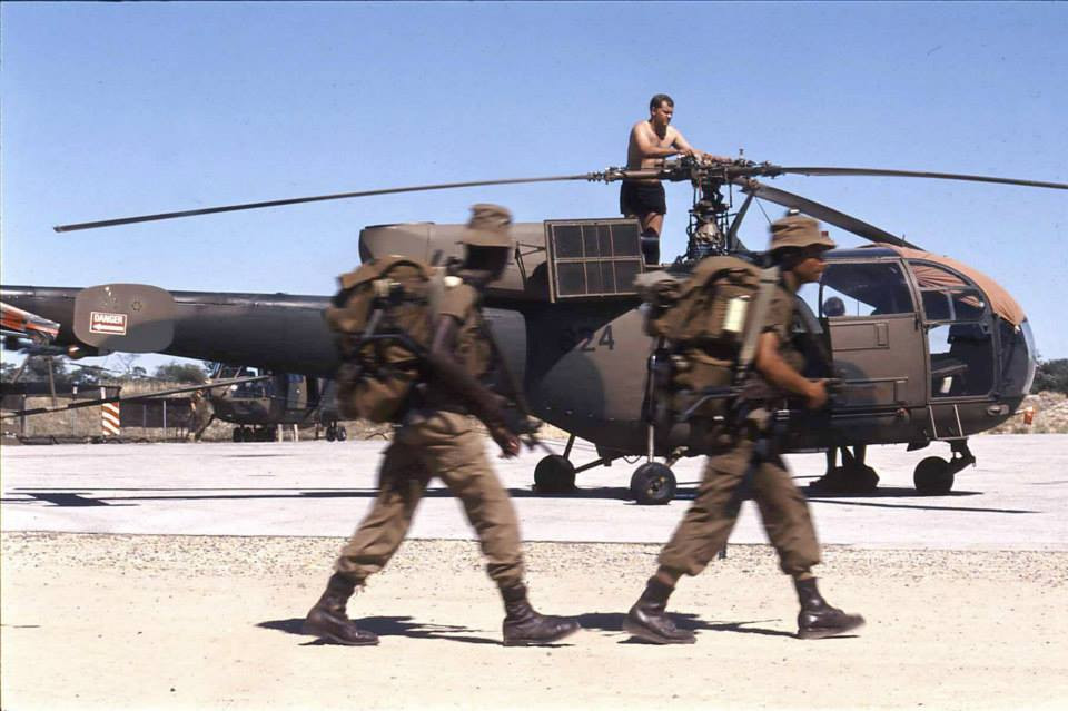 SADF joint army and air force operations in South West Africa (now Namibia). 1988 #Ondangwa Air Force Base (AFB), here is a great photo capturing a reaction force on the move, here seen walking past a SAAF Alouette III under general maintenance on the apron. Photo copyright Outapi War Museum.