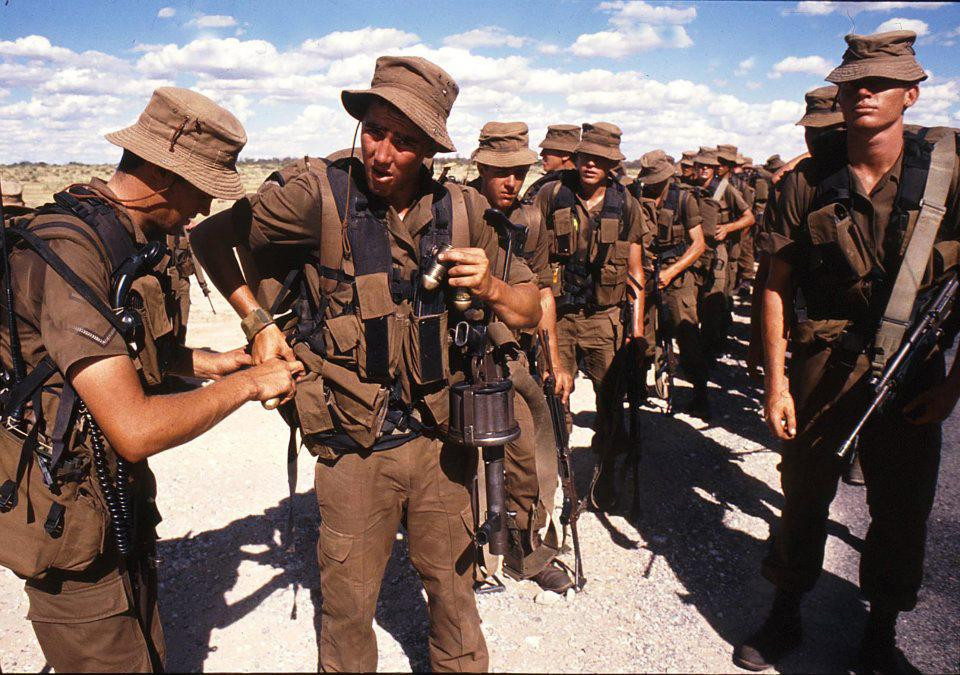 This is a SADF patrol final inspection (thought to be 5 SAI), this was usually performed by the section leaders before the platoon moves out. His job was to check that every man’s kit is in full order. Here he checks the ammunition and kit of the man allocated the 40 mm multiple grenade launcher. Photo courtesy of the Outapi War Museum. Story for…Read More