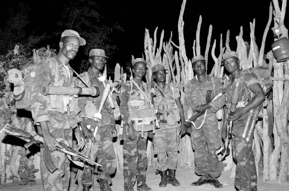 Well armed SWAPO PLAN operators prepare to move out from a ‘kraal’ after conducting an insurgent mission into South West Africa/Namibia.