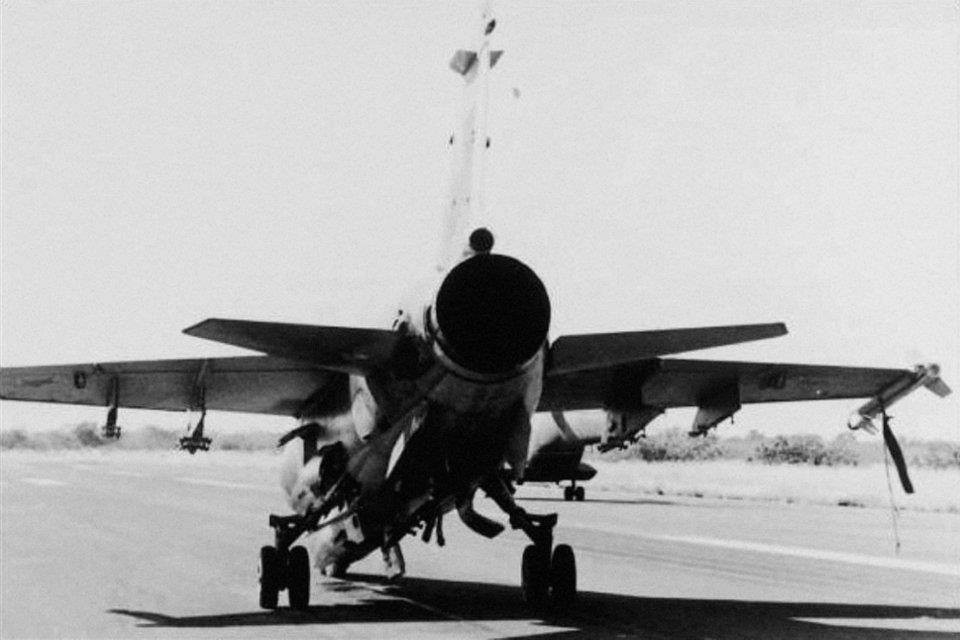 07 June 1980. The South African Air Force Mirage F1AZ 237 of Captain Isak C. du Plessis on the runway at Ruacana, after making an emergency landing after sustaining battle damage.